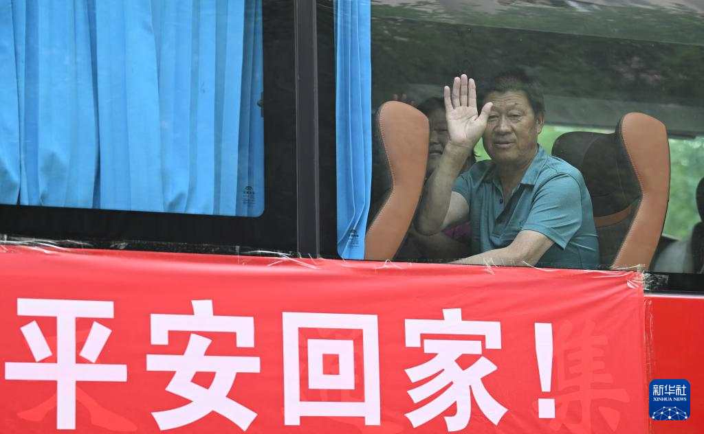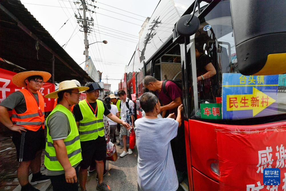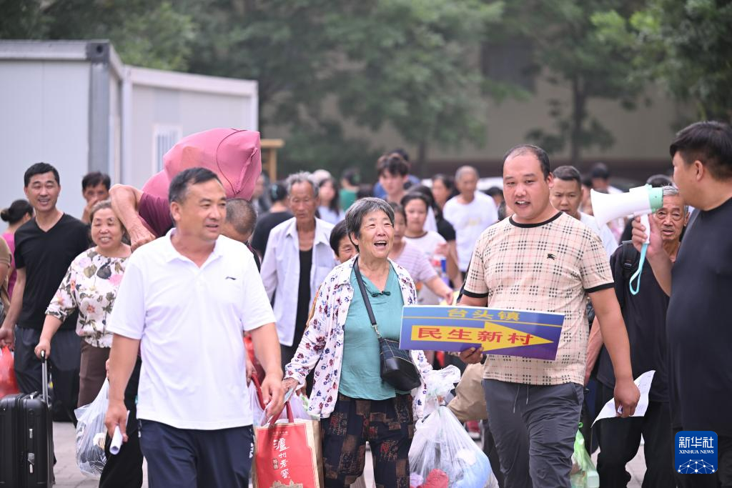 8月20日,在天津市西青区赤龙南街道一临时安置点,村民准备乘车回家。新华社记者 孙凡越 摄