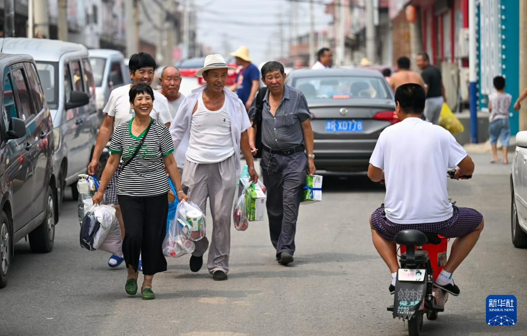 8月20日,在天津市静海区台头镇,返村村民在街上相互问候。新华社记者 孙凡越 摄pagebreak