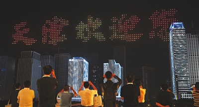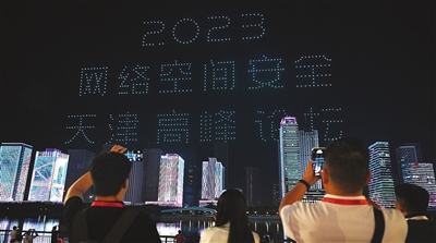昨晚,参加首届网络空间安全(天津)高峰论坛的嘉宾观看无人机表演。