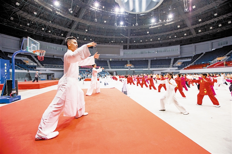 2023年天津市全民健身助力乡村振兴社会体育指导员指导服务项目培训,近日在市奥林匹克中心体育馆开展,每日针对不同群体需求进行太极柔力球、广场舞、啦啦操、太极拳、八段锦等项目的教学培训。图为天真园太极文化园青年教师带领教学方阵进行太极拳演练。(崔宪伟摄)