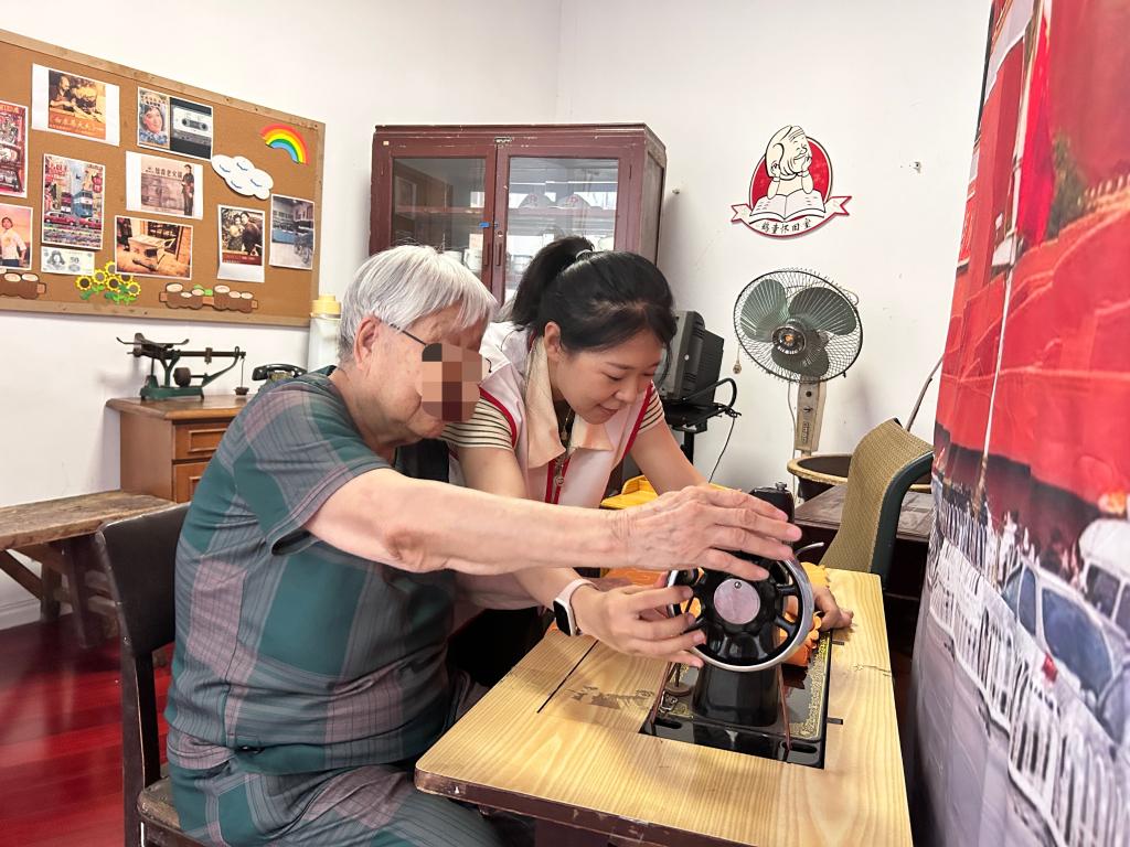 2023年8月7日,在“忘不了怀旧角”,医务社工协助认知症患者使用缝纫机。