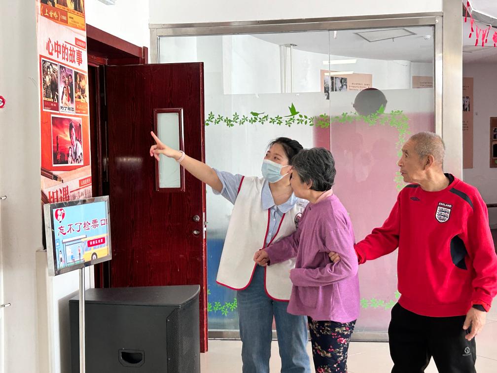 2023年5月3日,医务社工在“忘不了电影院”给认知症老人推荐电影。