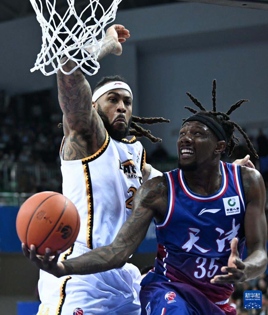 11月6日,天津先行者队球员马克(右)在辽宁本钢队球员莫兰德的防守下上篮。新华社记者 孙凡越 摄pagebreak