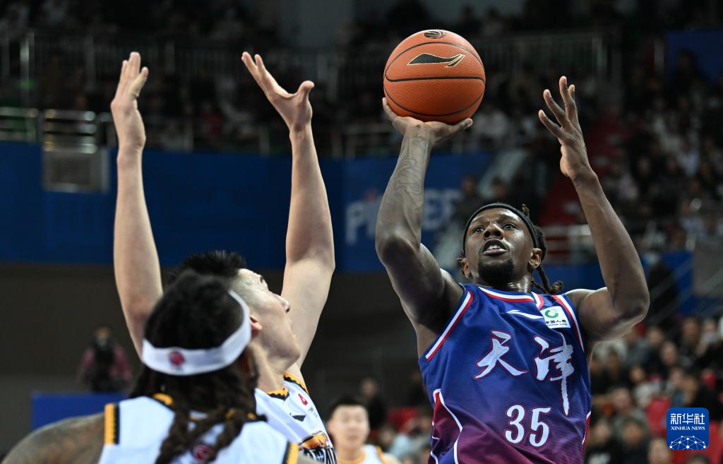 11月6日,天津先行者队球员詹姆斯(中)在比赛中投篮。新华社记者 孙凡越 摄pagebreak
