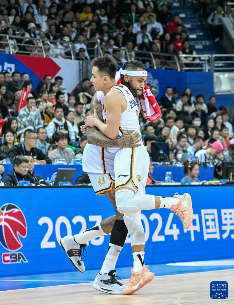 11月6日,辽宁本钢队球员莫兰德(后)与队友赵继伟在比赛间隙庆祝。新华社记者 孙凡越 摄pagebreak