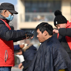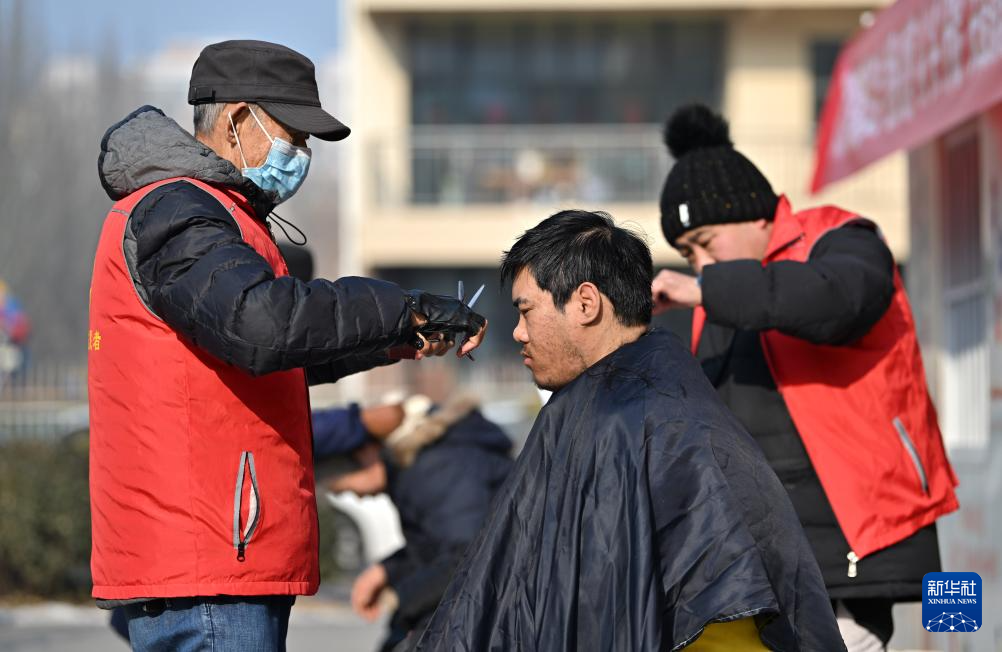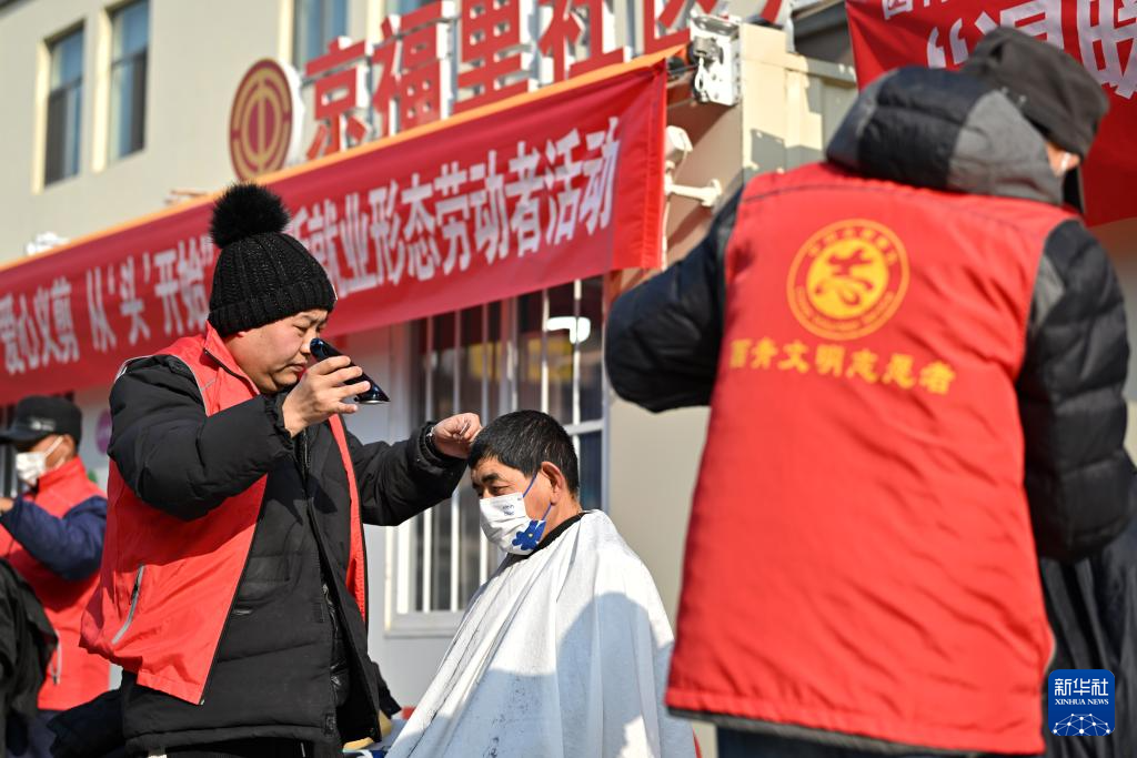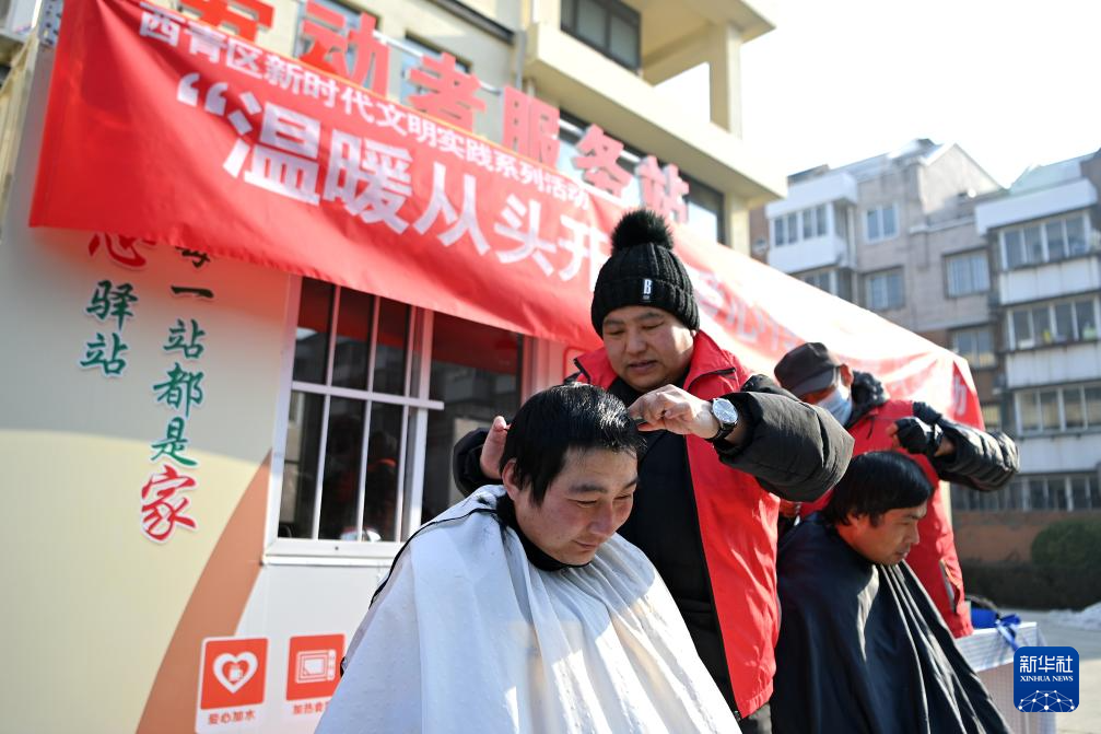 1月11日,理发师在给户外劳动者剪头发。新华社记者李然摄pagebreak