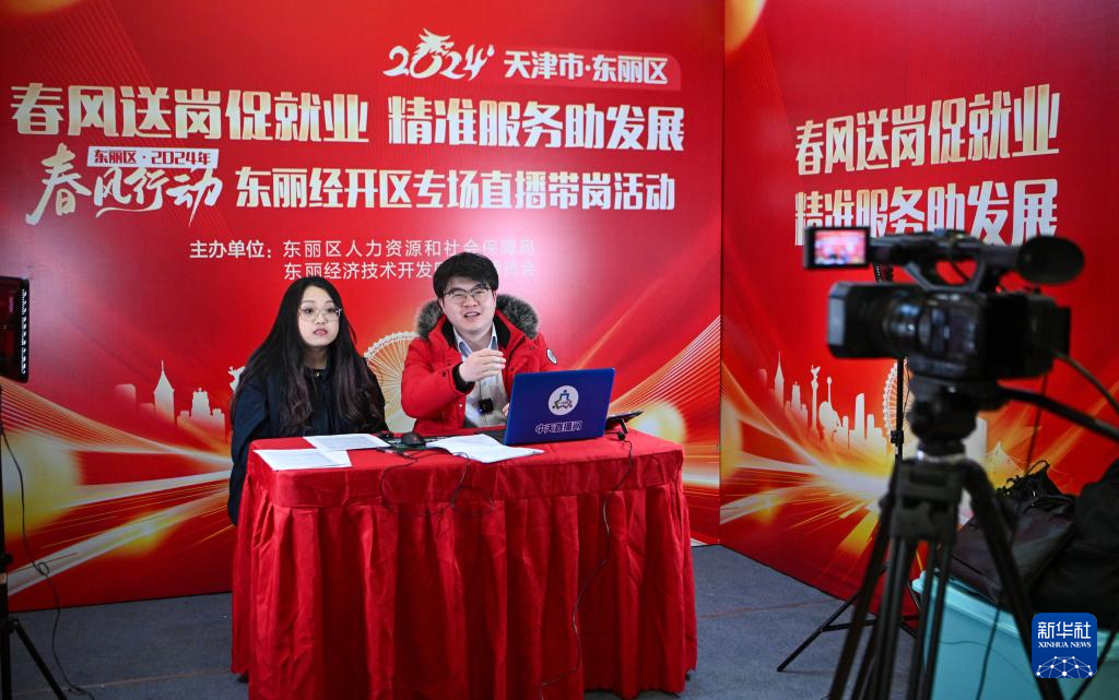 2月29日,主播在天津市东丽区一场招聘会上进行直播带岗。新华社记者 孙凡越 摄
