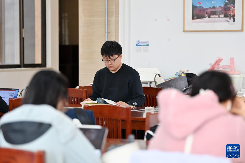 在南开大学图书馆,佟泽栋(中)在翻阅专业书籍(5月3日摄)。新华社记者 李然 摄pagebreak
