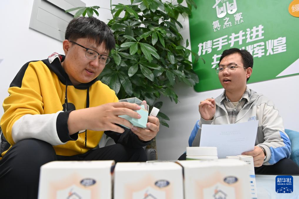 在天开高教科创园,佟泽栋(左)和小伙伴交流公司业务(4月27日摄)。新华社记者 李然 摄pagebreak