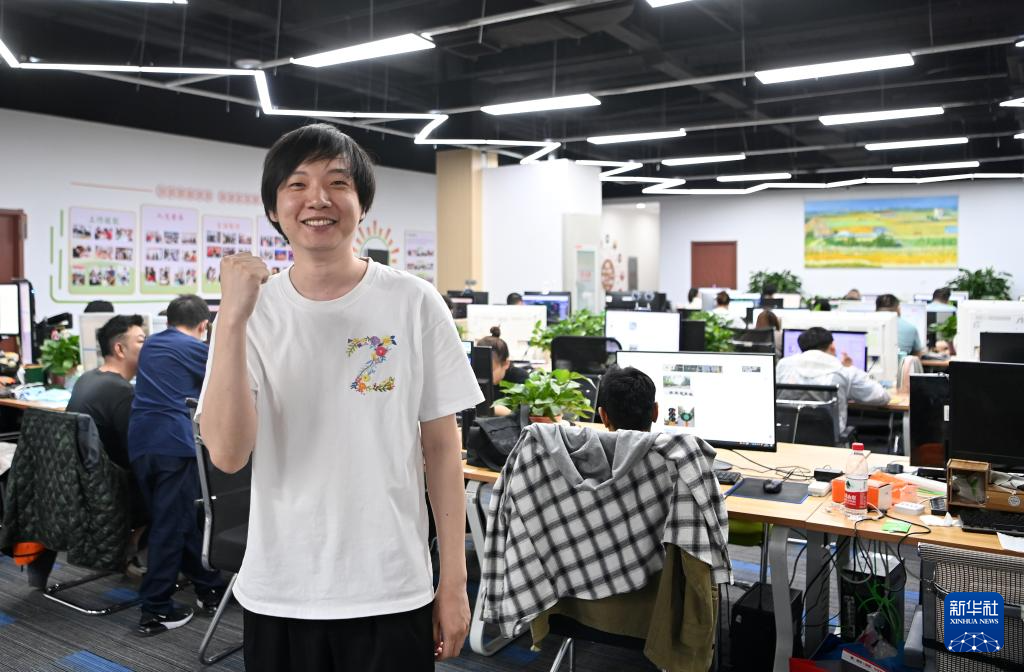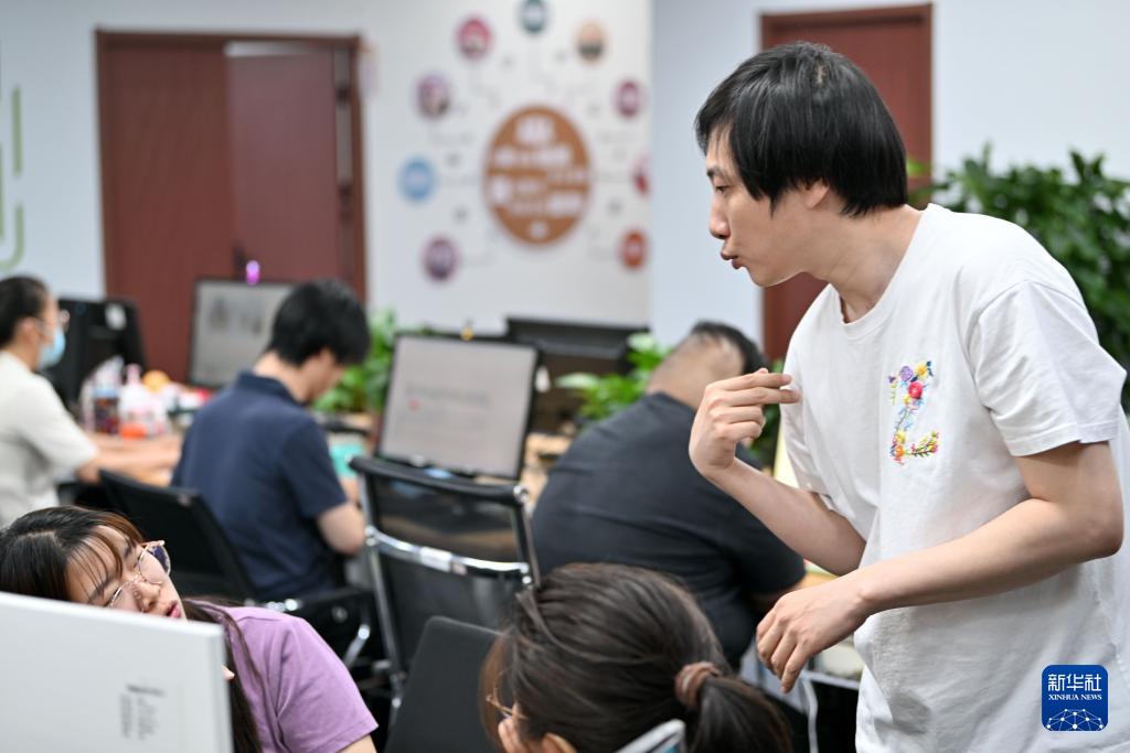 张子悦在天津市南开区悦动广场的办公地上班(5月17日摄)。今年32岁的张子悦是一位听障人士,他现在是创美助残基地的人工智能训练师。他很喜欢这份工作,经常主动加班帮助新来的同事适应快节奏的工作。