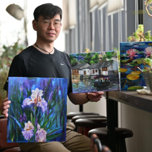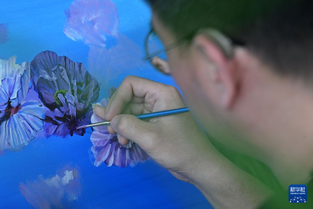 赵鹏在天津市西青区的商业公寓内进行绘画工作(5月16日摄)。今年40岁的赵鹏是一位听障人士,他现在是创美助残基地的彩绘画师,赵鹏最大的愿望便是能举办画展。