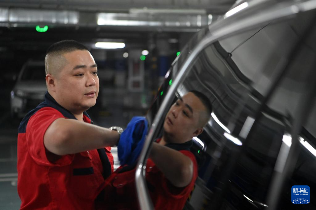 宋磊在天津市西青区新城市中心的地下停车场为客户洗车(5月16日摄)。今年40岁的宋磊在十多年前因为意外失去了左手,他现在是创美助残基地洗车组的组长。宋磊的愿望是将现有的流动洗车搬到店面运营,扩大经营业务。