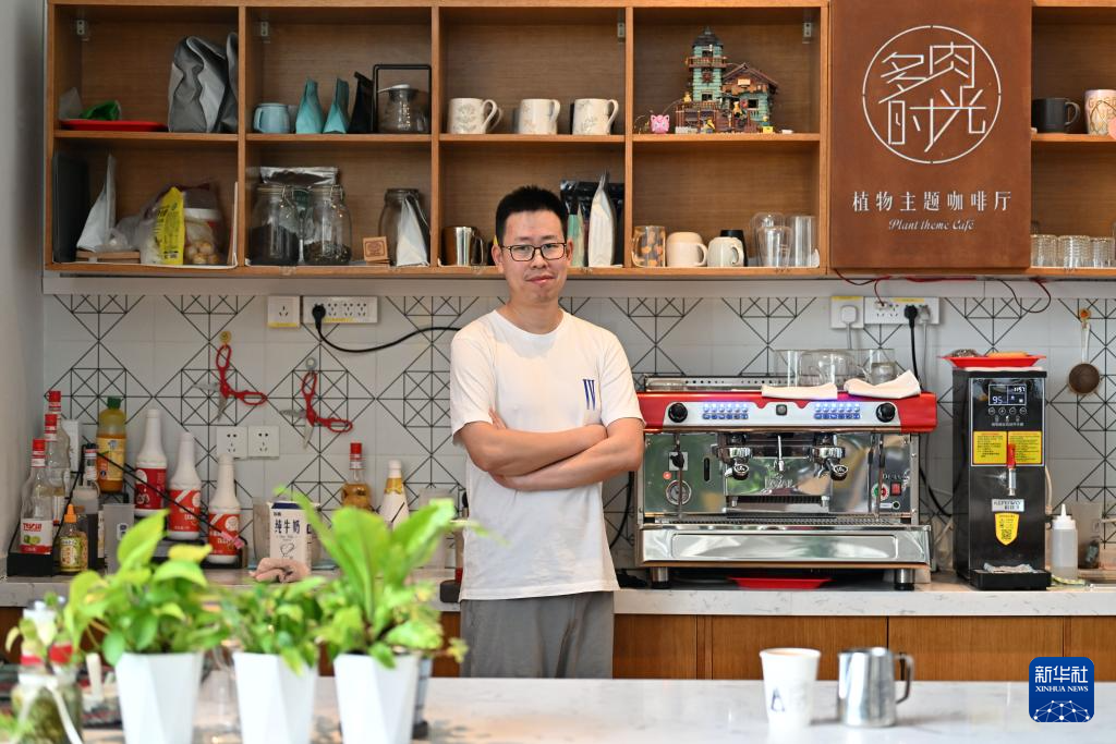 刁文超在天津市西青区的咖啡厅内工作(5月16日摄)。今年37岁的刁文超是一位听障人士,他现在是创美助残基地的咖啡师。来到创美助残基地后,刁文超在同事的帮助下开始学习制作咖啡,并逐渐能够独立接待客户,语言能力也得到提升。