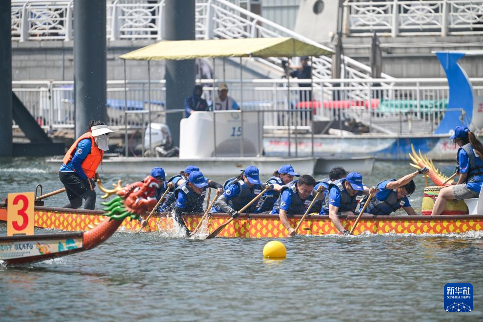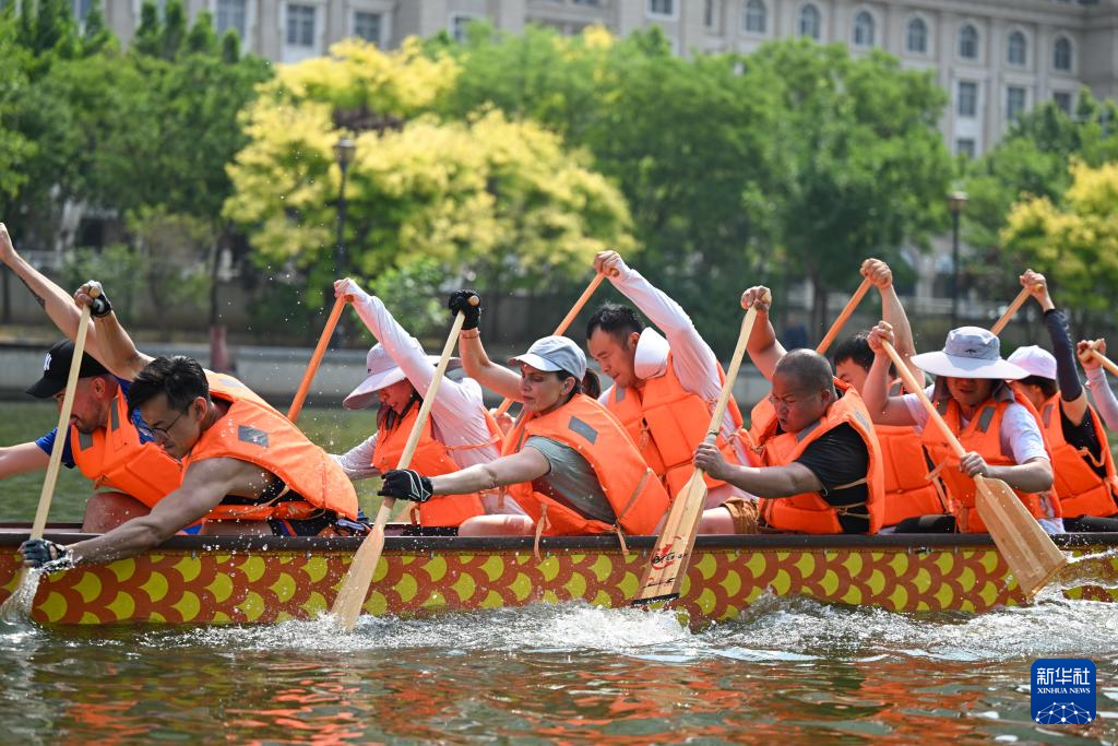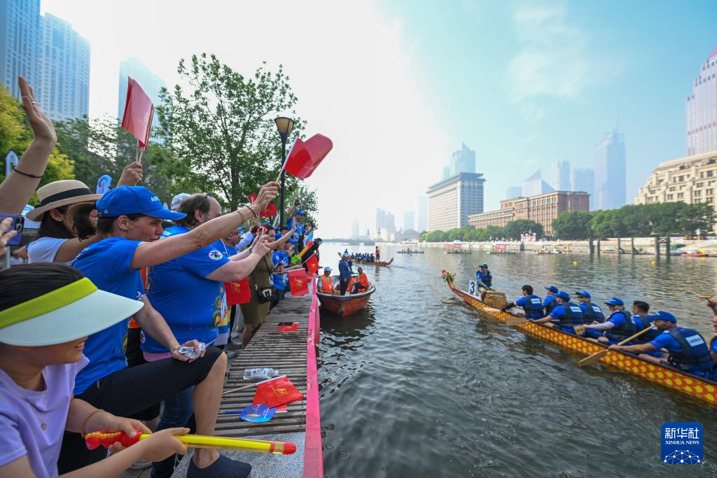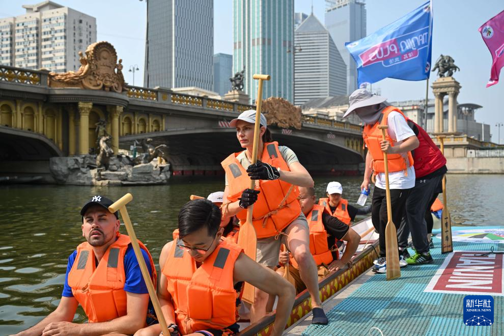 端午节当日,2024年天津海河龙舟赛在天津海河大光明桥附近水域举行。36支代表队约500人参与比赛。这是来自空中客车中国公司的西班牙籍工程师劳拉·莫拉首次参加海河龙舟赛。