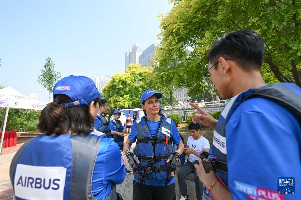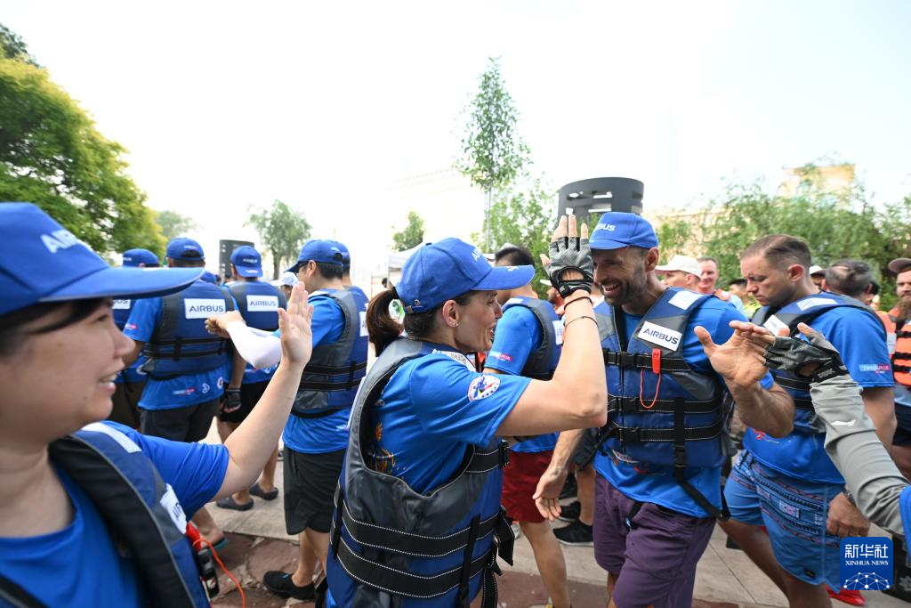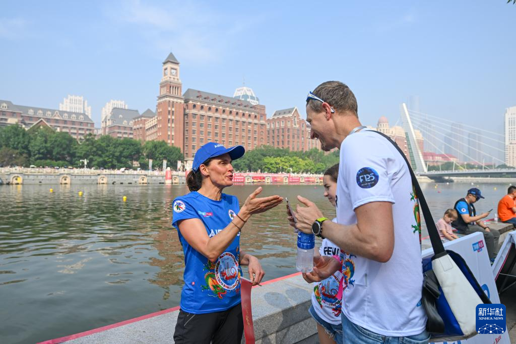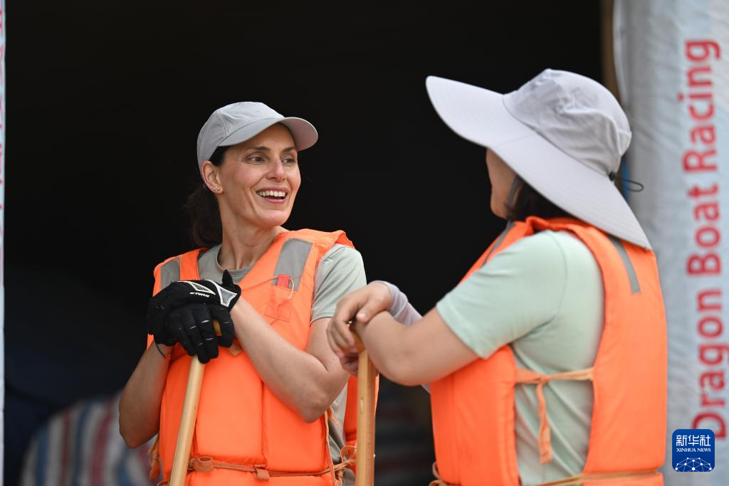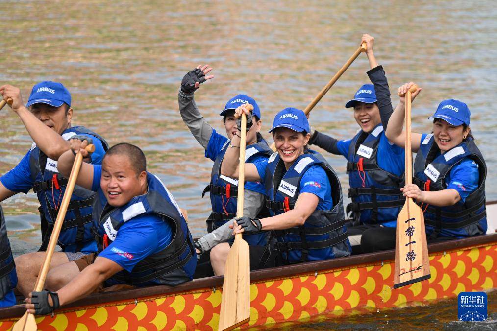 6月10日,劳拉·莫拉(左二)向另一支刚刚完成预赛的空中客车龙舟队打招呼。新华社记者 孙凡越 摄pagebreak
