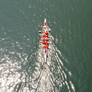 6月6日,空中客车龙舟男女混合队在天津海河上训练(无人机照片)。新华社记者 孙凡越 摄