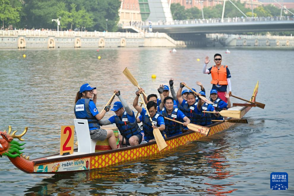 6月10日,空中客车龙舟男女混合队在海河龙舟赛男女混合组决赛比赛中。新华社记者 孙凡越 摄pagebreak