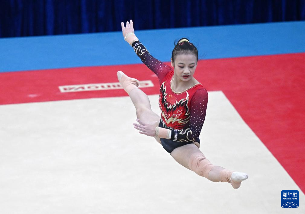 6月12日,中国体操队队员邱祺缘在自由体操比赛中。她以总分56.331的成绩获得女子个人全能第一名。新华社记者 赵子硕 摄pagebreak