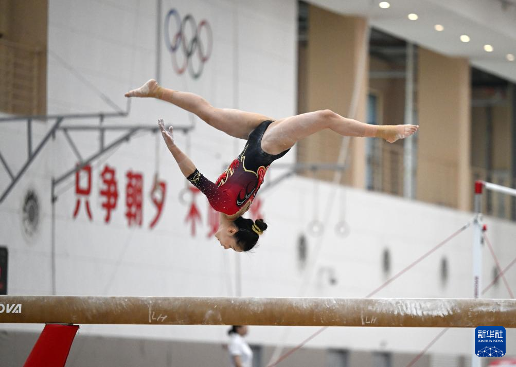 6月12日,中国体操队队员邱祺缘在平衡木比赛中。她以总分56.331的成绩获得女子个人全能第一名。新华社记者 赵子硕 摄