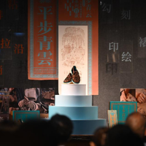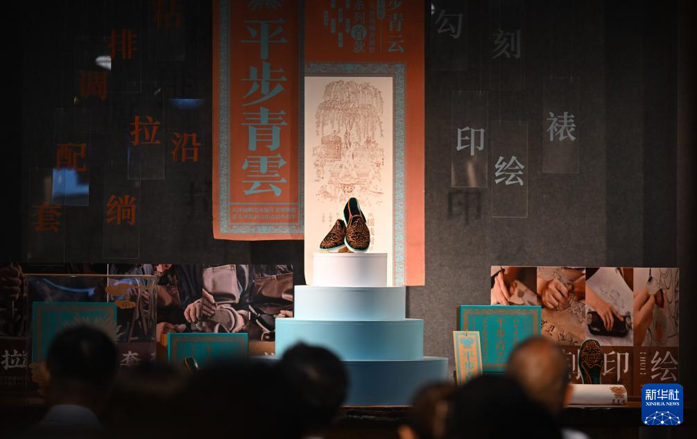 8月8日拍摄的老美华与天津杨柳青画社联名产品“平步青云”彩云鞋发布现场。新华社记者 孙凡越 摄