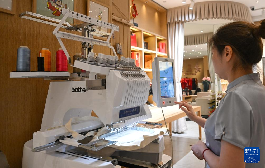 在老美华旗舰店,工作人员根据顾客喜好定制刺绣样式(7月15日摄)。新华社记者 孙凡越 摄pagebreak