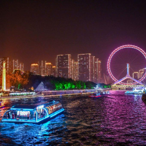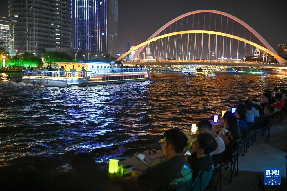 8月10日,游客乘坐海河游船游览天津夜景。新华社记者 孙凡越 摄