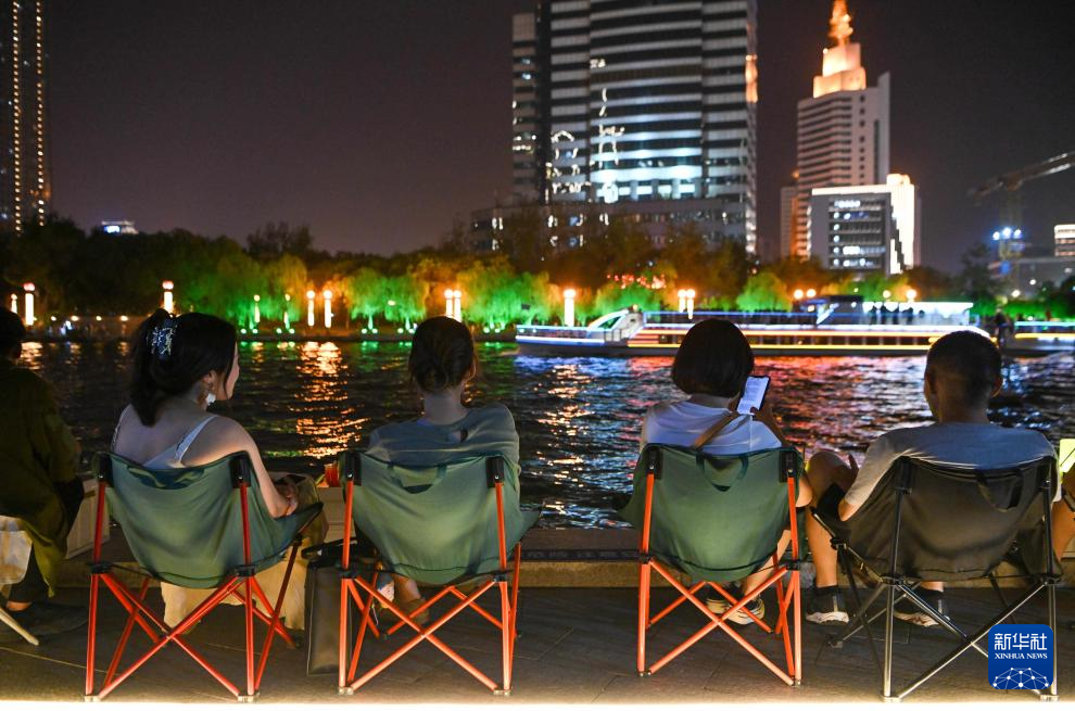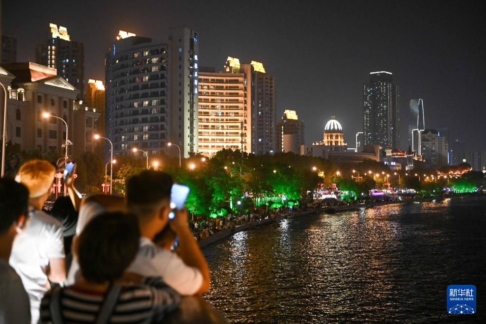 暑假夜晚的天津中心城区海河两岸流光溢彩,热闹非凡。人们来到海河畔听户外音乐会,散步纳凉,在休闲中品味美好生活。