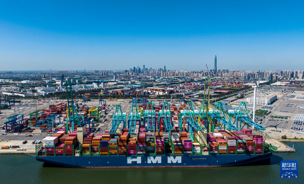 货轮停靠在天津港集装箱码头(8月27日摄,无人机照片)。新华社记者 赵子硕 摄pagebreak