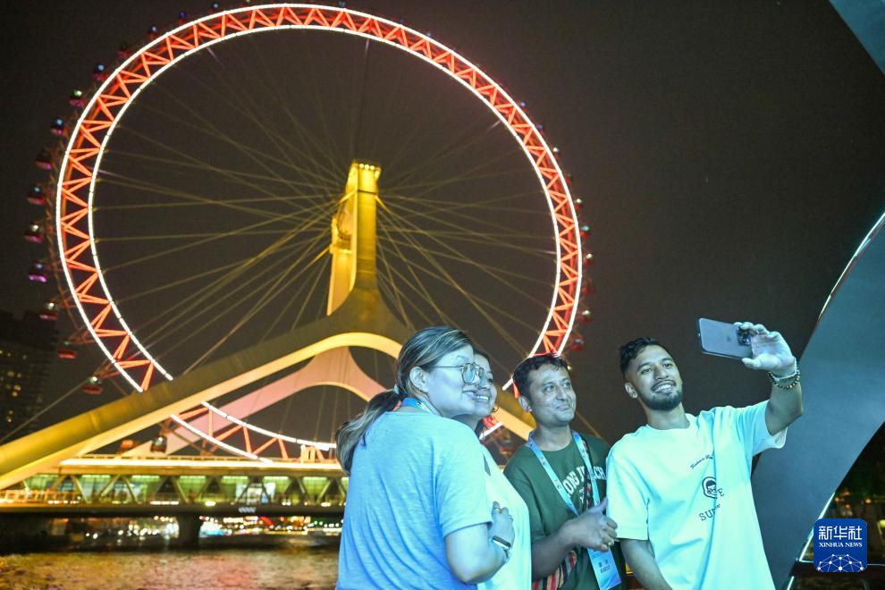 来自尼泊尔的游客乘坐海河游船与“天津之眼”摩天轮打卡合影(8月25日摄)。新华社记者 孙凡越 摄pagebreak