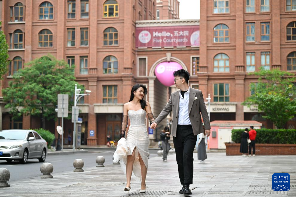 一对恋人携手走在天津解放北路历史文化街区内(5月5日摄)。新华社记者 孙凡越 摄pagebreak
