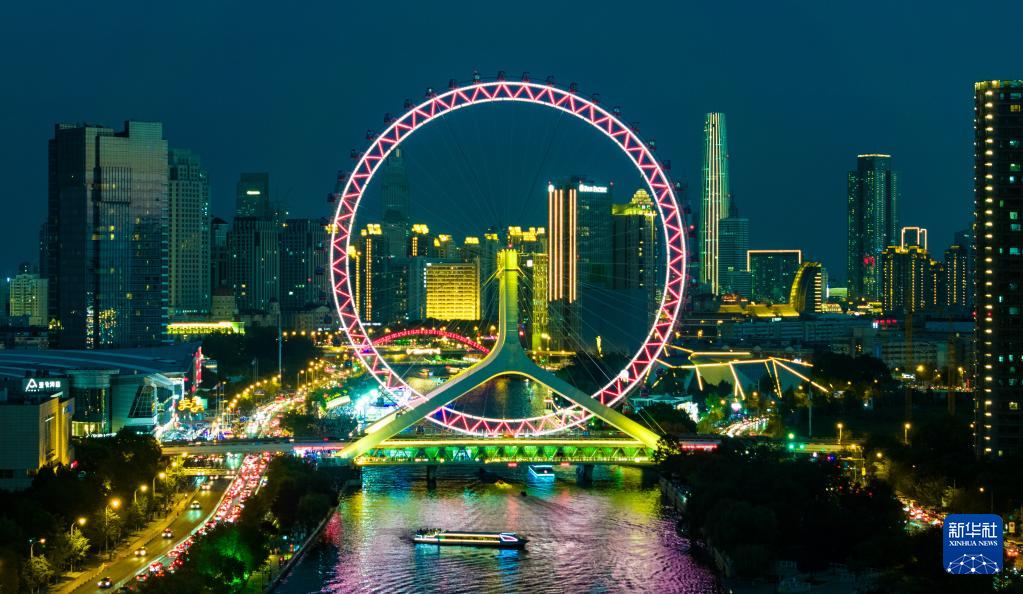 这是8月22日拍摄的“天津之眼”摩天轮及海河夜景(无人机照片)。新华社记者 孙凡越 摄pagebreak
