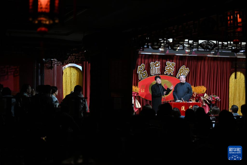 在天津市南开区古文化街名流茶馆,相声演员在台上演出(5月24日摄)。新华社记者 李然 摄pagebreak