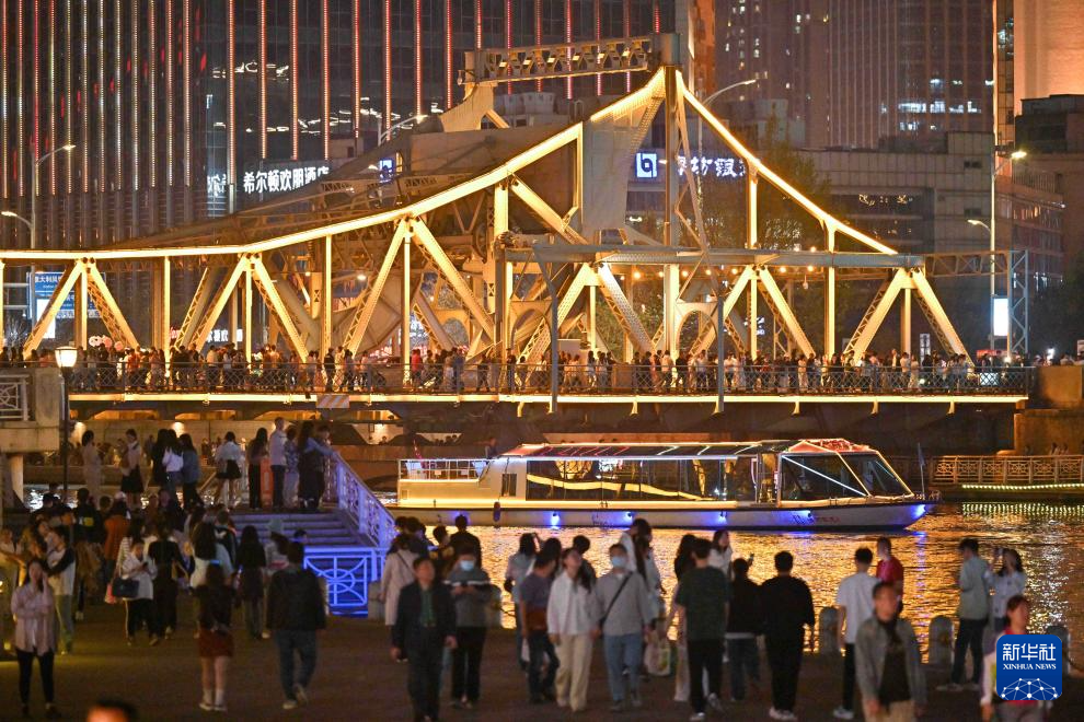市民游客在天津解放桥附近欣赏海河夜景(4月12日摄)。新华社记者 孙凡越 摄pagebreak