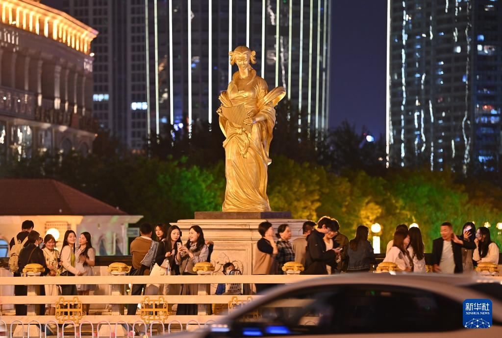 游人在天津市北安桥上的乐女雕塑旁游赏(5月1日摄)。新华社记者 李然 摄pagebreak