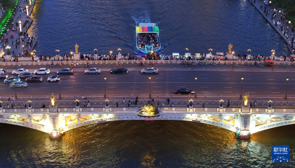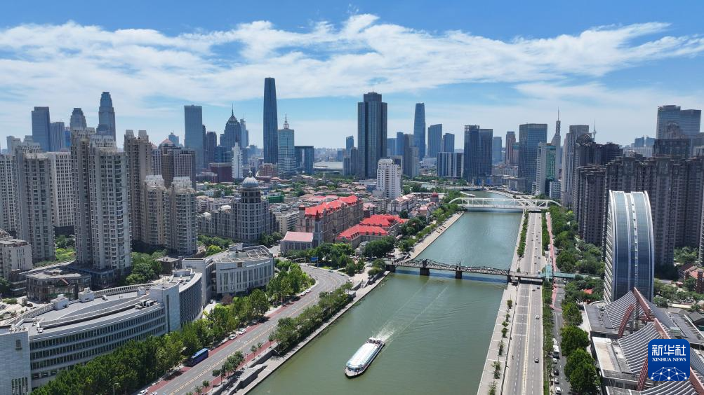 一艘海河游船航行通过天津中心城区金汤桥水域(7月17日摄,无人机照片)。新华社记者 孙凡越 摄pagebreak