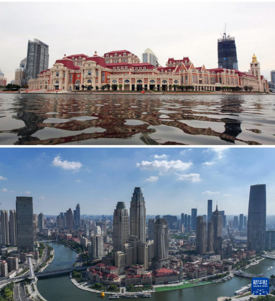 拼版照片,上图为:2009年9月7日拍摄的天津津湾广场(资料照片);下图为:2024年8月22日拍摄的天津津湾广场及海河沿岸建筑群(新华社记者孙凡越摄)。新华社发pagebreak