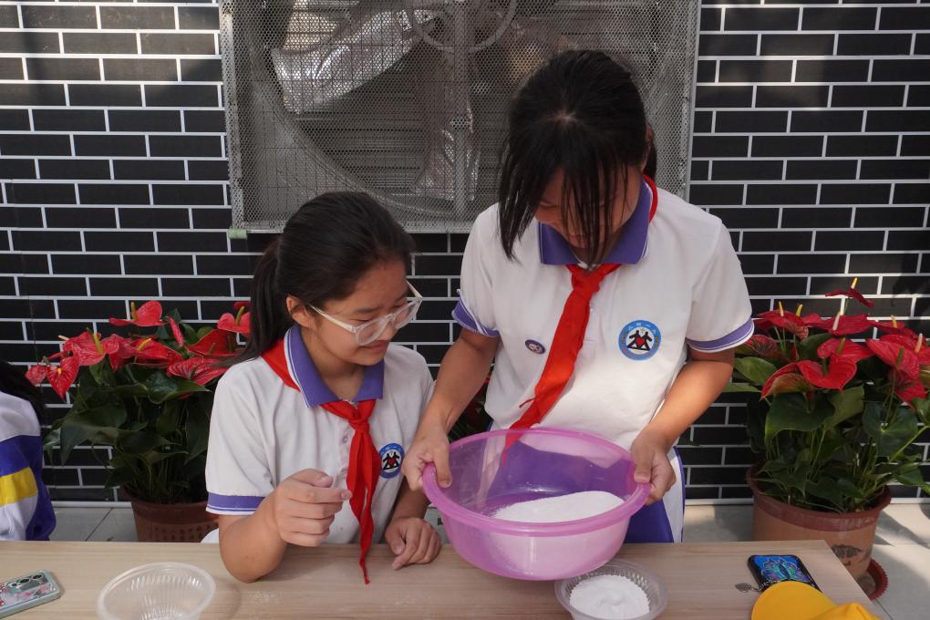 加水搅拌、撒粉过筛、填入模具、轻轻按压后顺利脱模……同学们全神贯注,小心翼翼地跟随每一个示范动作。12岁的陈可滢目不转睛地注视着自己的模具,当一块软糯且弹性十足的米糕脱模而出时,她不禁露出喜悦的笑容。“真没想到,一粒小小的稻米竟然能变化出这么多的形态。”陈可滢兴奋地说。