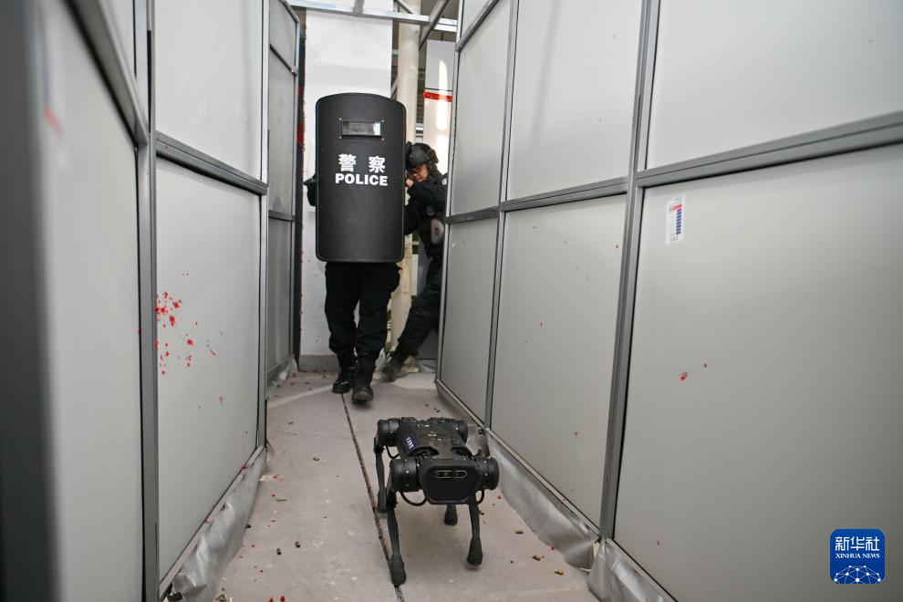 1月8日,在天津市公安局特警总队,特警一支队队员与机器犬配合演练。新华社记者 孙凡越 摄