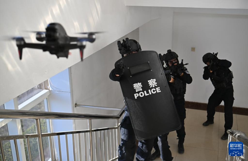1月8日,在天津市公安局特警总队,特警一支队队员与穿越机配合演练。新华社记者 孙凡越 摄pagebreak