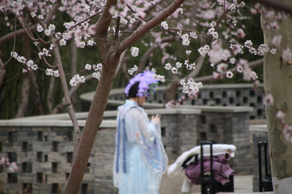 桃花堤上,身穿汉服的表演者在一遍遍排练着舞步,可爱亲切的活动吉祥物人偶“俏桃桃”不时出现在桃花丛中。