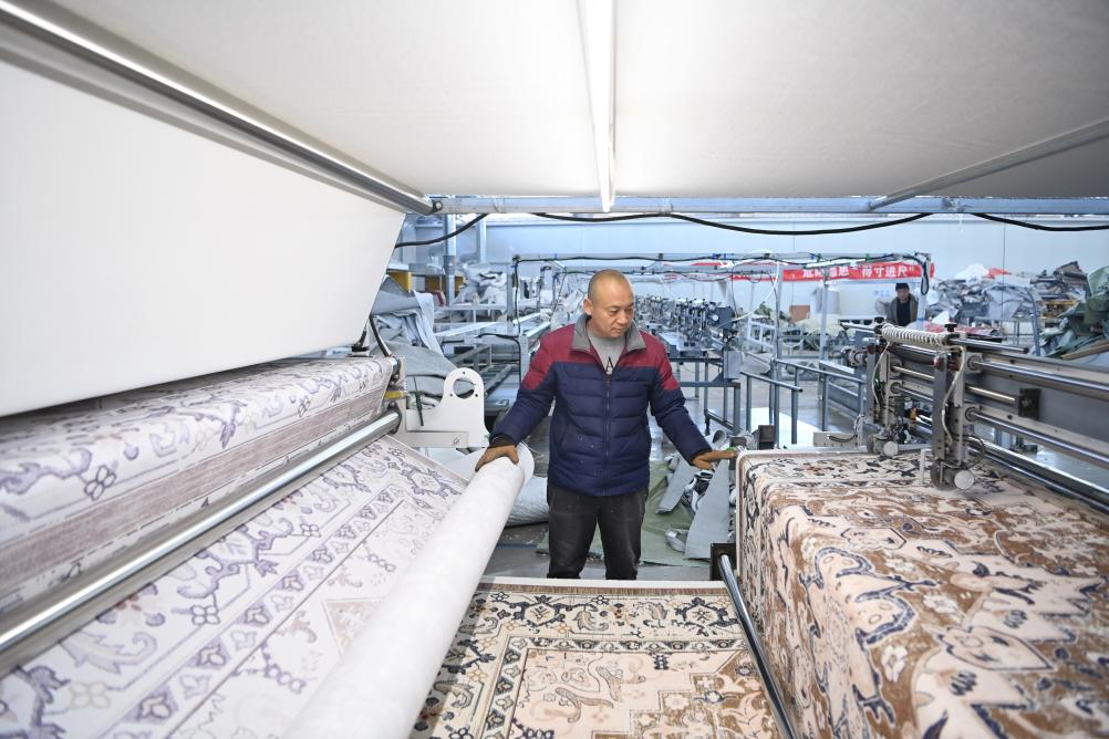跟随周新亮步入公司生产车间,织毯机器隆隆作响,工人们埋头劳作,一垛垛成品地毯被贴签装箱,准备发往世界各地。周新亮说,去年冬天以来,地毯生产进入旺季,来自国内外的订单将一季度排得满满当当。
