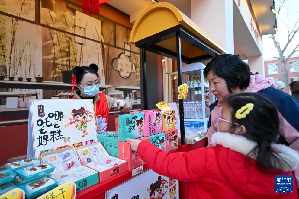 游客在天津哪吒小镇购买糕点产品(3月16日摄)。新华社记者 孙凡越 摄pagebreak
