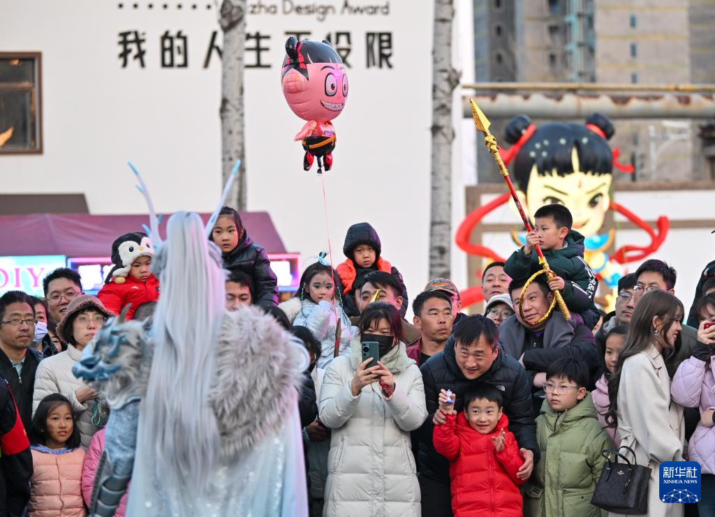 身着哪吒服饰的演员在天津哪吒小镇为游客演出(3月15日摄)。新华社记者 孙凡越 摄
