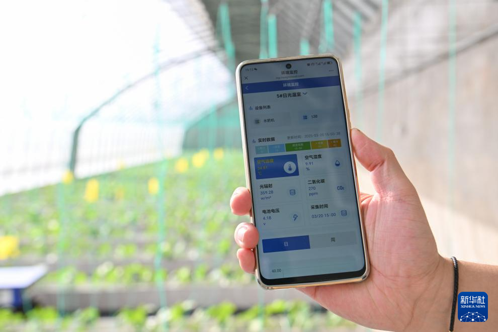 在农芯科技(天津)有限责任公司智慧农业园区,科研人员通过手机实时查看温室内的环境数值(3月20日摄)。新华社记者 孙凡越 摄pagebreak