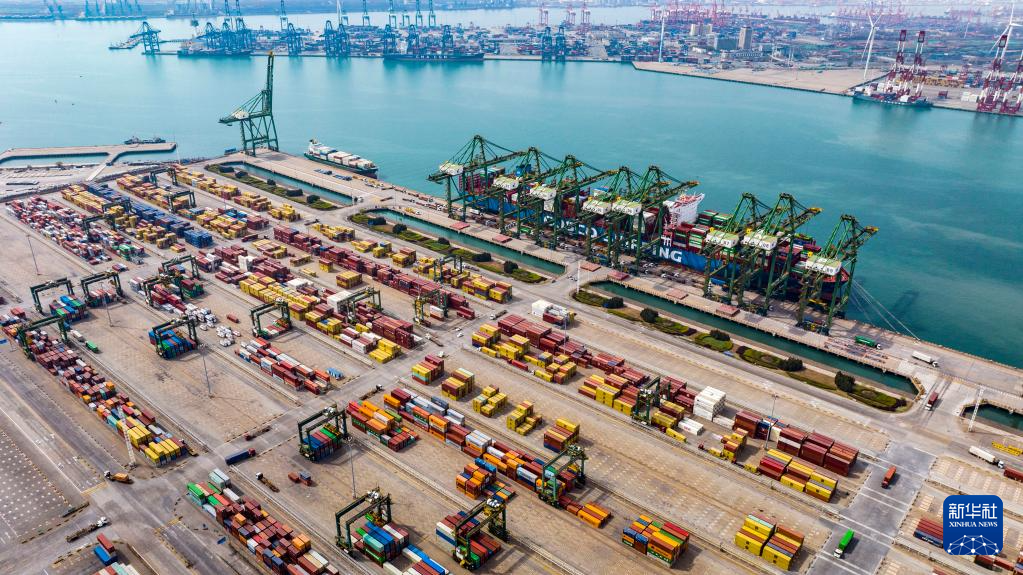 这是4月8日拍摄的天津港集装箱码头一景(无人机照片)。新华社记者 赵子硕 摄pagebreak