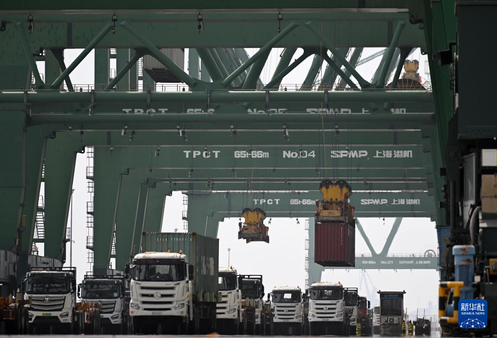 4月8日,工人驾驶车辆在天津港太平洋国际集装箱码头转运集装箱。新华社记者 赵子硕 摄