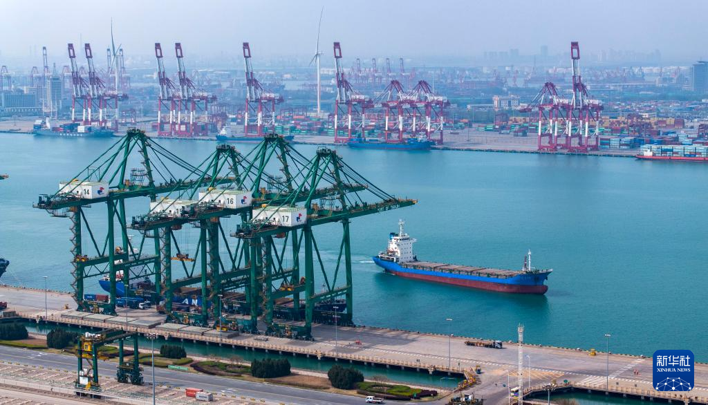 4月8日,一艘货轮准备靠泊在天津港太平洋国际集装箱码头(无人机照片)。新华社记者 赵子硕 摄pagebreak