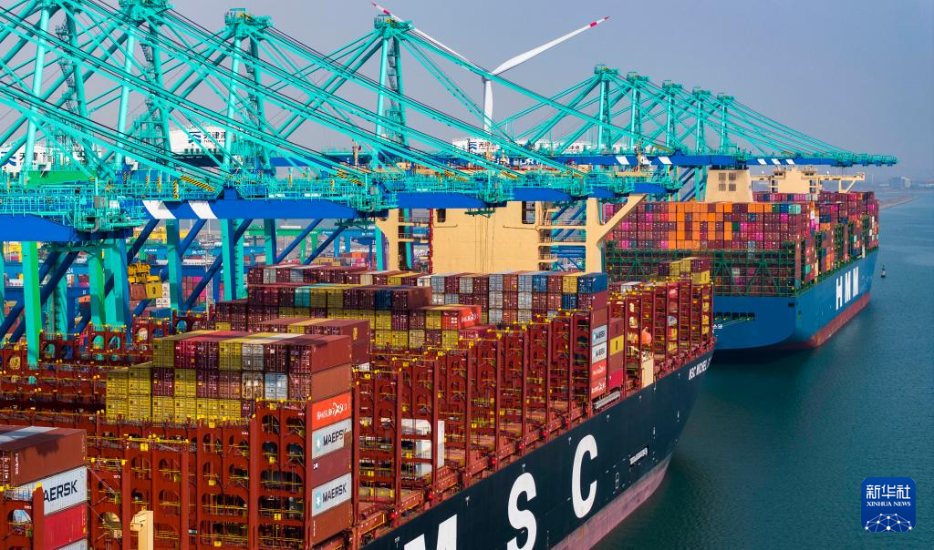 4月8日,货轮停靠在天津港集装箱码头进行装卸作业(无人机照片)。新华社记者 赵子硕 摄