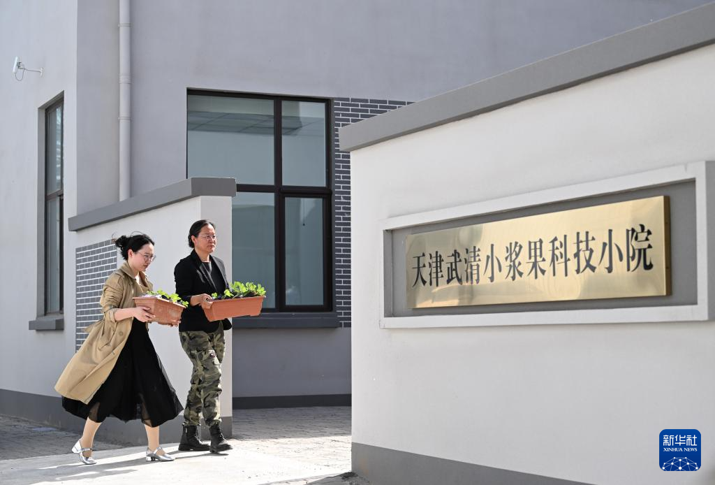 在天津武清小浆果科技小院,导师王丽娟(右)与学生恽子怡搬运草莓实验苗(4月24日摄)。新华社记者 孙凡越 摄