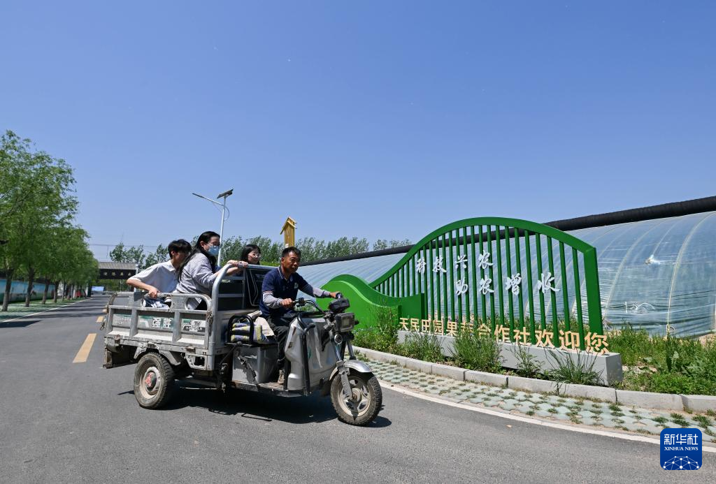 在天津天民田园农业科技示范园,农业科技员陈相涛(右)带领学生们在大棚间穿梭(4月29日摄)。新华社记者 孙凡越 摄pagebreak